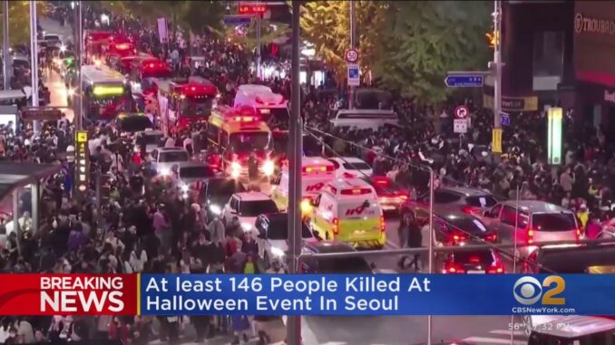 Праздник Хэллоуин в столице Южной Кореи в субботу закончился трагедией. По меньшей мере 146 человек погибли и еще не менее 150 пострадали после того, как толпа людей оказалась в ловушке, а затем была раздавлена в узком переулке.