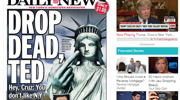 НА обложке Нью-Йорк Дейли Ньюс — американская статуя свободы показывающая жест, обозначающий «фау ю», и надпись — упади мертвым, Тэд. Так «неполиткоректно» атреагировал Нью-Йорк на заявление одного из кандидатов от республиканской партии Тэда Круза о «особых нью-йоркских ценностях» — либерализме, правах на аборты и браки геев якобы присущим Нью-Йоркцам и отличающих жителей мегаполиса от остальной америки.