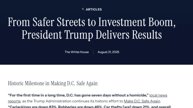 «Впервые за долгое время в округе Колумбия семь дней не было убийств», — сообщают местные новости , поскольку администрация Трампа продолжает свои исторические усилия по возвращению Вашингтону безопасности . «Количество угонов автомобилей сократилось на 83%. Количество грабежей сократилось на 46%. Количество краж автомобилей сократилось на 21%, а общее количество насильственных преступлений — на 22%».