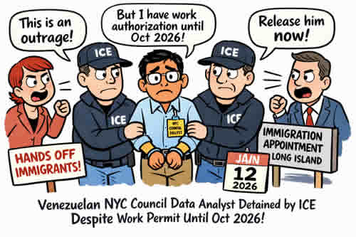 Аналитик данных в городском совете Нью-Йорка иммигрант из Венесуэлы12 января 2026 года он был задержан Иммиграционной и таможенной службой (ICE) во время планового визита в иммиграционную службу на Лонг-Айленде, несмотря на наличие разрешения на работу до октября 2026 года.