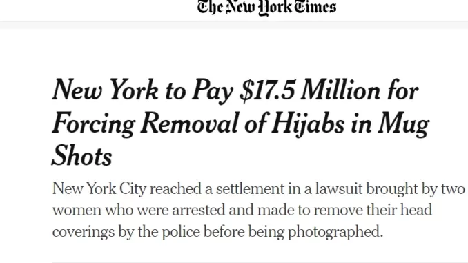 Как сообщается в этой же статье Нью Йорк Таймс : В 2018 году городские власти Нью!Йорка заключил сделку на сумму $60 000 с каждой из трех мусульманских женщин, которых вынуждали снимать свои хиджабы для фотографий при аресте и заявили, что их религиозные права были нарушены.