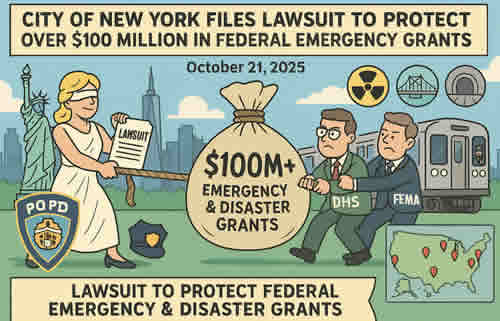 В каждом из последних трёх финансовых лет Нью-Йорк получал около 150 миллионов долларов в виде грантов на финансирование важнейших программ по управлению в чрезвычайных ситуациях в NYPD, Департаменте транспорта Нью-Йорка и других городских агентствах. Однако в 2025 финансовом году в рамках «Стандартных положений и условий» Министерство внутренней безопасности приняло незаконные новые условия, требующие от получателей подтверждения того, что они «не осуществляют никаких программ, которые продвигают или содействуют „разнообразию, равенству, инклюзивности и доступности“», и требующие соблюдения всех указов президента Дональда Трампа, чтобы иметь право на получение средств. Гранты Министерства внутренней безопасности помогают местным органам власти готовиться к таким стихийным бедствиям, как террористические акты, массовые расстрелы, киберинциденты и другие сложные чрезвычайные ситуации, реагировать на них и восстанавливаться после них, что ставит под угрозу критически важные службы для многих сообществ, включая Нью-Йорк.