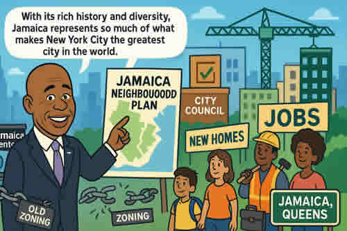 Мэр Нью-Йорка Эрик Адамс приветствовал голоса комитетов по землепользованию и зонированию городского совета за продвижение его плана района Ямайка, в результате чего вопрос о перезонировании Квинса будет передан на рассмотрение полного городского совета в конце этого месяца. Предложение, представленное как попытка дать толчок строительству жилья и созданию рабочих мест в ключевом транспортном узле, предусматривает создание крупнейшей в городе зоны обязательного инклюзивного жилья в 230 кварталах и, как ожидается, позволит открыть тысячи единиц жилья, включая постоянно доступное жилье. План также предусматривает выделение сотен миллионов долларов на модернизацию канализации с целью снижения риска наводнений. Адамс назвал этот шаг частью своей более широкой программы поддержки жилищного строительства, направленной на отмену устаревших правил и ускорение строительства, поблагодарив спикера Адриенн Адамс, председателя комитета по землепользованию Рафаэля Саламанку-младшего, председателя подкомитета по зонированию Кевина Райли и членов городского совета Джеймса Дженнаро и Нантушу Уильямс за их поддержку.