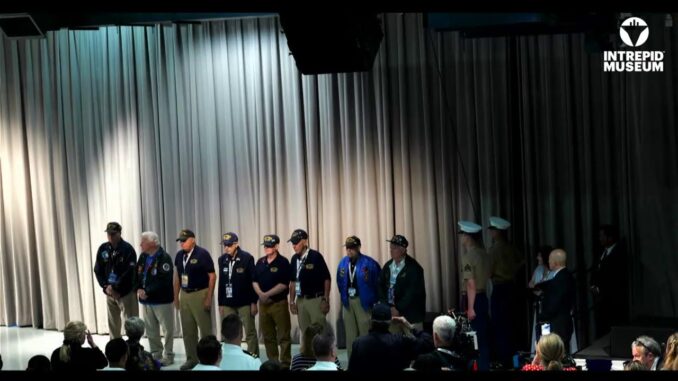 НЬЮ-ЙОРК – Ветераны, действующие военнослужащие и гражданские лица были приглашены на борт Intrepid Museum/Музея «Бесстрашный» на церемонию Дня памяти. В этом году церемонию пришлось перенести в Музей «Бесстрашный» из-за погоды. После выступлений высокопоставленных чиновников, в том числе мэра Эрика Адамса, четыре церемониальных венка были возложены в реку Гудзон. Все это в честь мужчин и женщин, которые принесли высшую жертву во время службы в вооруженных силах США. Церемония завершится тем, что ветераны развернут американский флаг, прозвучат торжественно трубы, и пролетят истребители ВМФ. Их полет будет включать Missing Man Formation – специальный ритуал почтения погибшим летчикам.