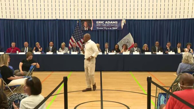 Мэр Эрик Адамс проводит беседу с «общественностью» о шелтерах для бездомных, государственном жилье и проблеме с нарушением правил велосипедистами в PS/IS 191 –
