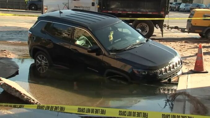 Нью-Йорк. Провал чуть не поглотил автомобиль в Бат-Бич после прорыва водопровода