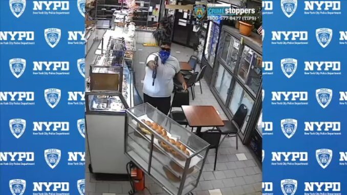 На кадрах, опубликованных полицией Нью-Йорка в среду вечером, видно, как потенциальный вор идет по закусочной с винтовкой наготове, отодвигает стул со своего пути и заходит в витрину. По словам полицейских, хулиган в бандане и солнцезащитных очках ворвался в итальянскую пекарню Paneoroma на Ямайка-авеню около 96-й улицы в Вудхейвене около 8 часов вечера 23 сентября, выхватил из рук большое черное оружие и потребовал деньги.