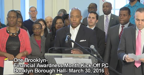 Brooklyn Borough President Eric L. Adams launched his third annual Financial Education Empowerment Month, in which he unveiled a legislative proposal to help new parents in New York City save money for their children’s college education.
