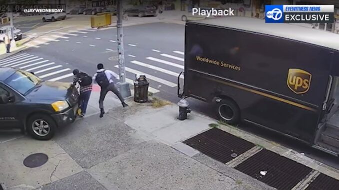 На видео с камер наблюдения, полученном эксклюзивно Eyewitness News, видно, как пикап Nissan врезался в двух мужчин, идущих по тротуару на улице Св. Николас-авеню между 148-й и 149-й улицами, прежде чем врезаться в заднюю часть припаркованного фургона UPS. Сила удара толкнула фургон дальше на улицу.