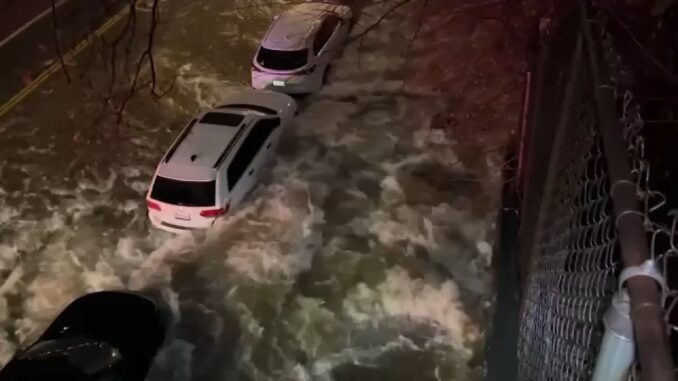 Вебстер-авеню оказалась полностью под водой. Автомобили были оставлены на месте из-за фонтанирующей воды под высоким давлением, которая лилась быстрее, чем территория могла ее впитать.