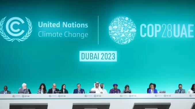 epa11003194 Dr. Sultan Ahmed Al Jaber (C), President-Designate of COP28, the UAE's Minister for Industry and Advanced Technology, UAE Climate Change Special Envoy and Managing Director and Group CEO of the Abu Dhabi National Oil Company (ADNOC) speaks, during the opening ceremony of COP28 Conference in Dubai, United Arab Emirates, 30 November 2023. The 2023 United Nations Climate Change Conference runs from 30 November to 12 December, and is expected to host one of the largest number of participants in the annual global climate conference as over 70,000 estimated attendees, including the member states of the UN Framework Convention on Climate Change (UNFCCC), business leaders, young people, climate scientists, Indigenous Peoples and other relevant stakeholders will attend. EPA/ALI HAIDER Dostawca: PAP/EPA.