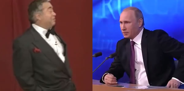 Выступление Путина. Синхронным переводчиком Гаранта в данном конкретном случае является Роман Карцев ( текст — М.Жванецкий). Карцев, как бы, озвучивает в общедоступной форме внутренний монолог всех сидящих и по ту, и по эту сторону экрана. Сравнить видео запись выступления Путина в декабре 2015, когда стоимость нефти упала и запись декабря 2014, время, когда еще российне скупали «не смешите наши искандеры» и была радость от «Крыманашего». Интересно послушать год спустя.