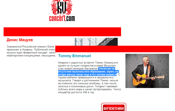 Электронная почта на русском языке в Нью-Йорке приносит в своих рассылках множество сюрпризов. Вот и сегодня, читатели рассылки от RuConcert.com порадовались сообщению о том, что оказывается талантливый ребенок Tommy Emmanuel » Несмотря на отсутствие музыкального образования, играть на гитаре …. начал еще в 4-х летнем возрасте.» Т.е . успел бы малыш получить бы образование — и музыкантом стал бы посолидней.