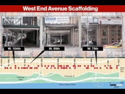 Вверх и вниз по всем 48 кварталам Вест-Энд-авеню, которая начинается на 107-й улице и заканчивается на 59-й улице, расположены ошеломляющие 85 навесов с строительными лесами, что делает его четвертым по количеству строительных лесов проспектом в городе, согласно городским данным.