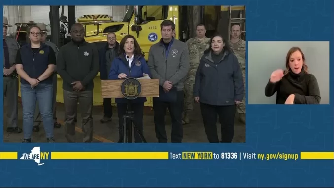 «Сегодня вечером находиться на дорогах будет небезопасно», — заявил Хочул в субботу, добавив, что запрет на поездки позволит бригадам попытаться не отставать от уборки снега.