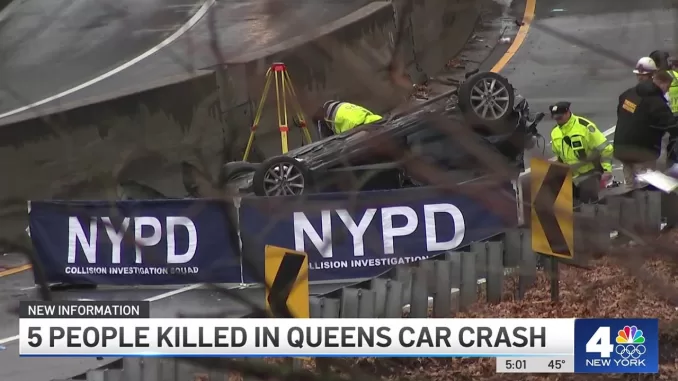 Полиция сообщила, что пять человек погибли в понедельник утром, когда их машина перевернулась , на бульваре Кросс-Айленд в Квинсе.