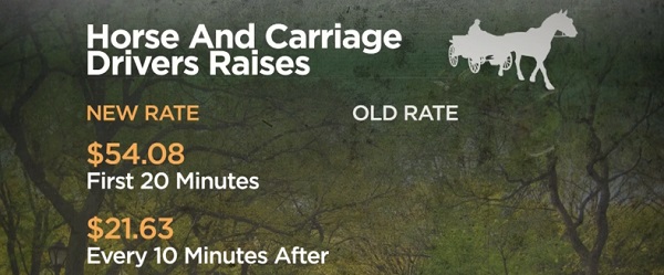 Нью-Йоркское управление Department of Consumer Affairs приняло решение разрешить официально поднять оплату за проезд на каретах для туристов которое приняла еще администрация Нью-Йорка Майкла Блумберга , но которую официально не признавали в связи с обязательстами нового мера Нью-Йорка Билла де Блазио de Blasio вообще использовать повозки с лошадьми для развлечения и перевозки туристов, в связи с требованиями защитников животных .
