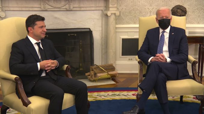 Президент Украины Владимир Зеленский на встрече в Вашингтоне с президентом США Джо Байденом — о проблемах сохранения границ Украины, о помощи в 60 миллионов долларов ( сравнить с триллионами на Афганистан ) , о войне на Донбассе, о энергитической безопасности Украины, о газопроводе Северный Поток 2, о членстве Украины в НАТО, о помощи захваченных Россией и поддерживаемых ею боевиками 150 человек и «самое главное» для Байдена — «совместная борьба с изменением климата ….